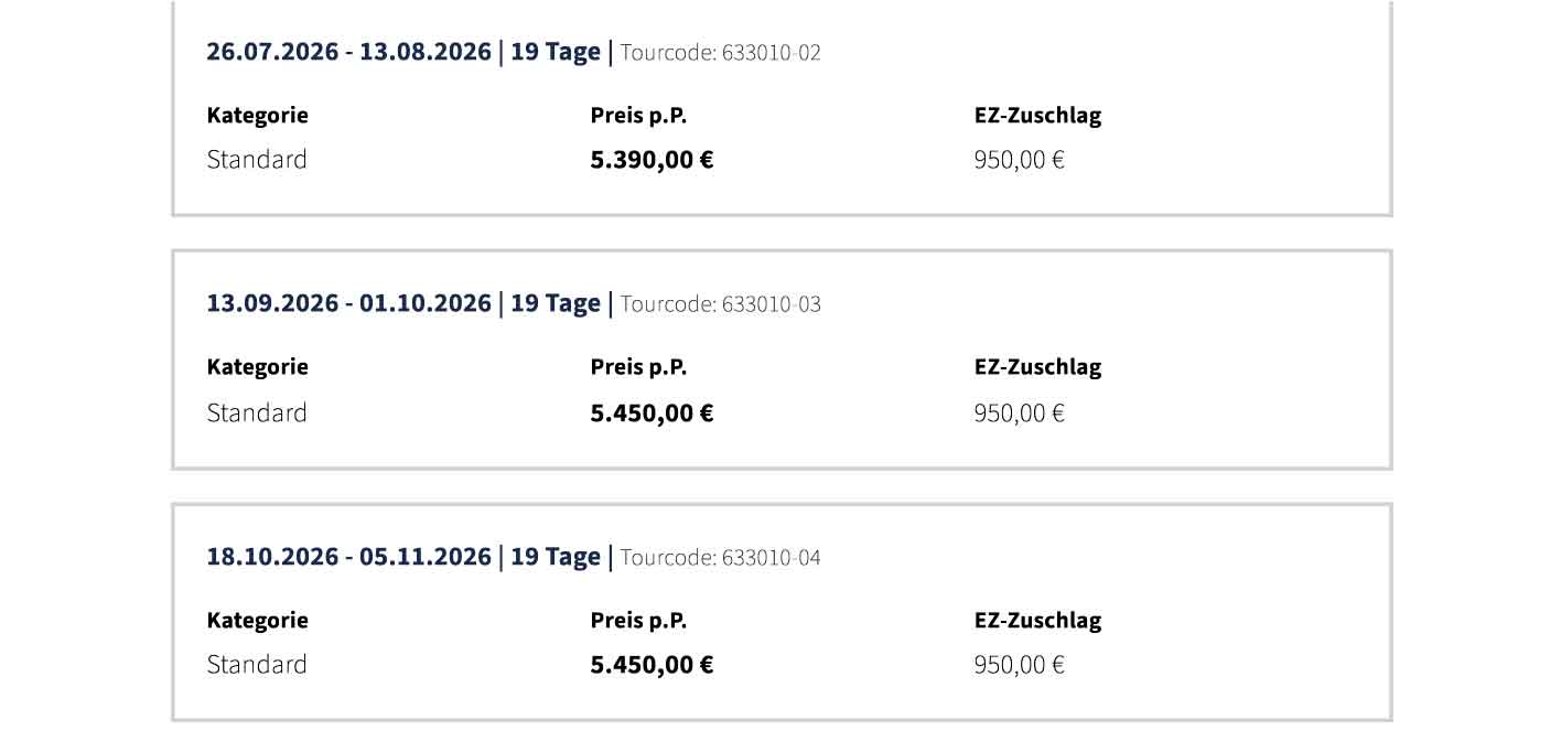 19 Tage inkl. Flug, 12.04., 26.07., 13.09., 18.10.26 schon ab 5.390,-€ p.P. im Doppelzimmer, Einzelzimmerzuschlag ab 820,-€ p.P.