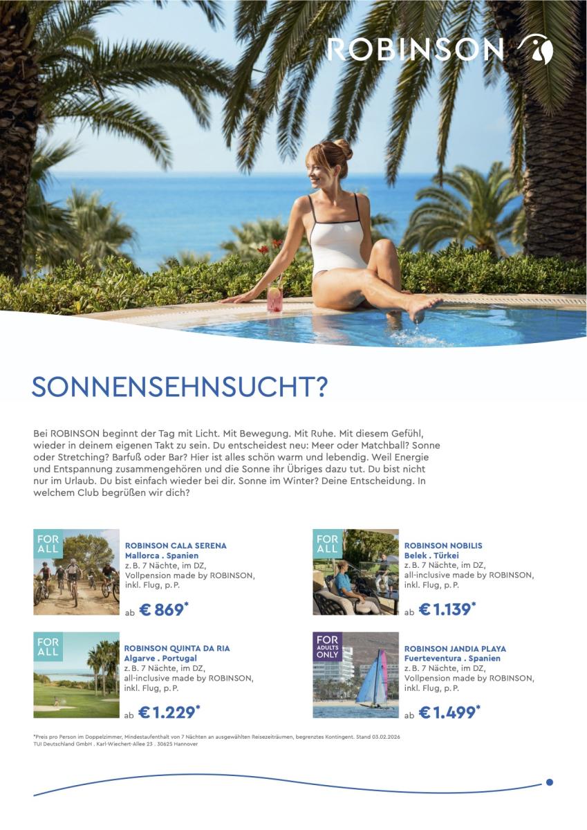 Mallorca, Cala Serena, schon ab 869,-€ p.P. Algave, Robinson Quinta Da Ria, schon ab 1.229,-€ p.P. Türkei, Belek, Robinson Nobilis, schon ab 1.139,-€ p.P. Fuerteventura, Jandia Playa, schon ab 1.499,-€ p.P.