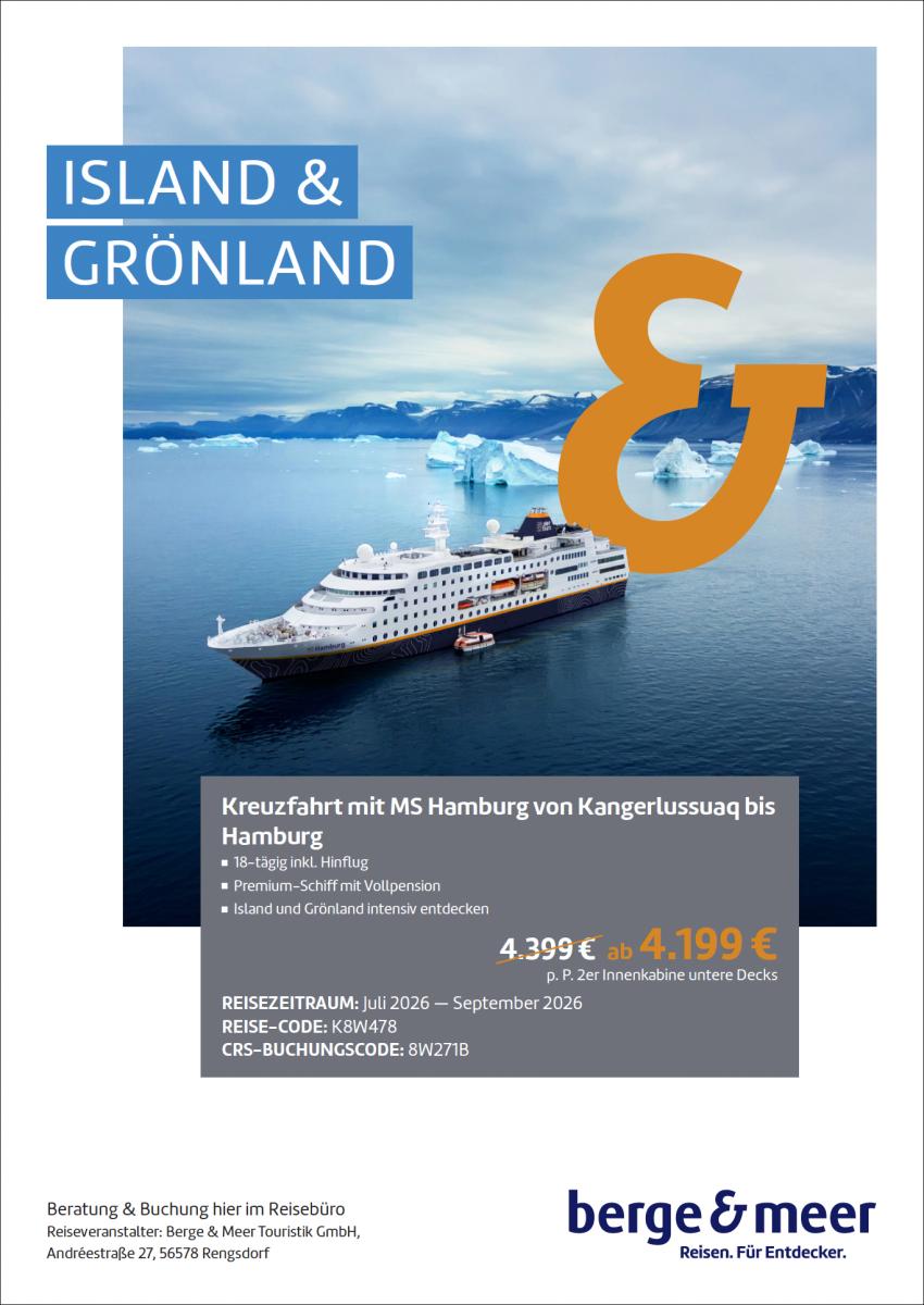 Island & Grönland, Kreuzfahrt mit MS Hamburg am 05.09.26 18 Tage inkl. Vollpension und Hinflug, Schon ab 4.199,-€ p.P. in der Innenkabine 100,-€ Bordguthaben inkl. p.P.