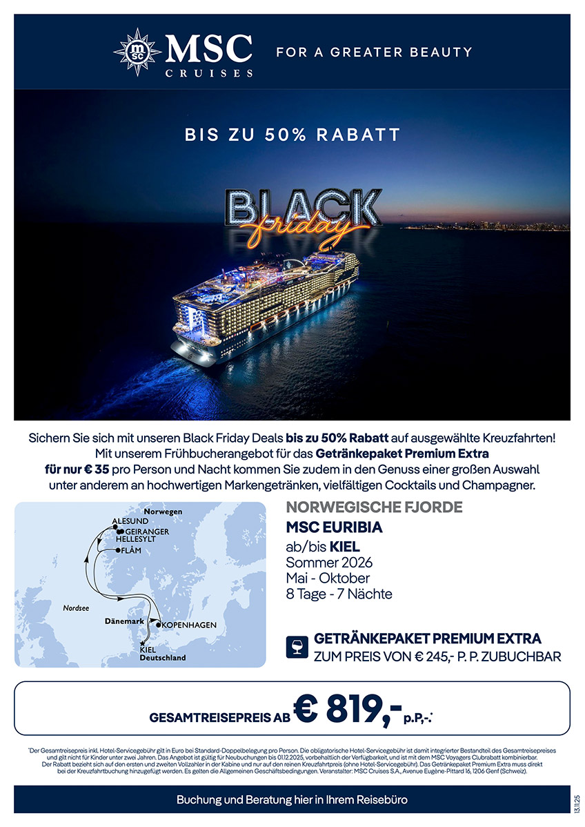 7 Nächte ab/bis Kiel, div. Abfahrten Mai-Okt 26 schon ab 819,-€ p.P.