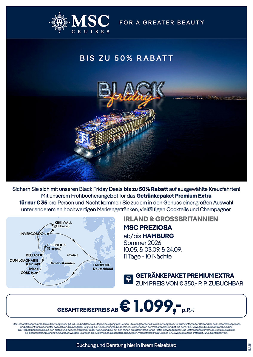 10 Nächte ab/bis Hamburg, Abfahrt 10.05.,03.09., 24.09.26 schon ab 1.099,-€ p.P.